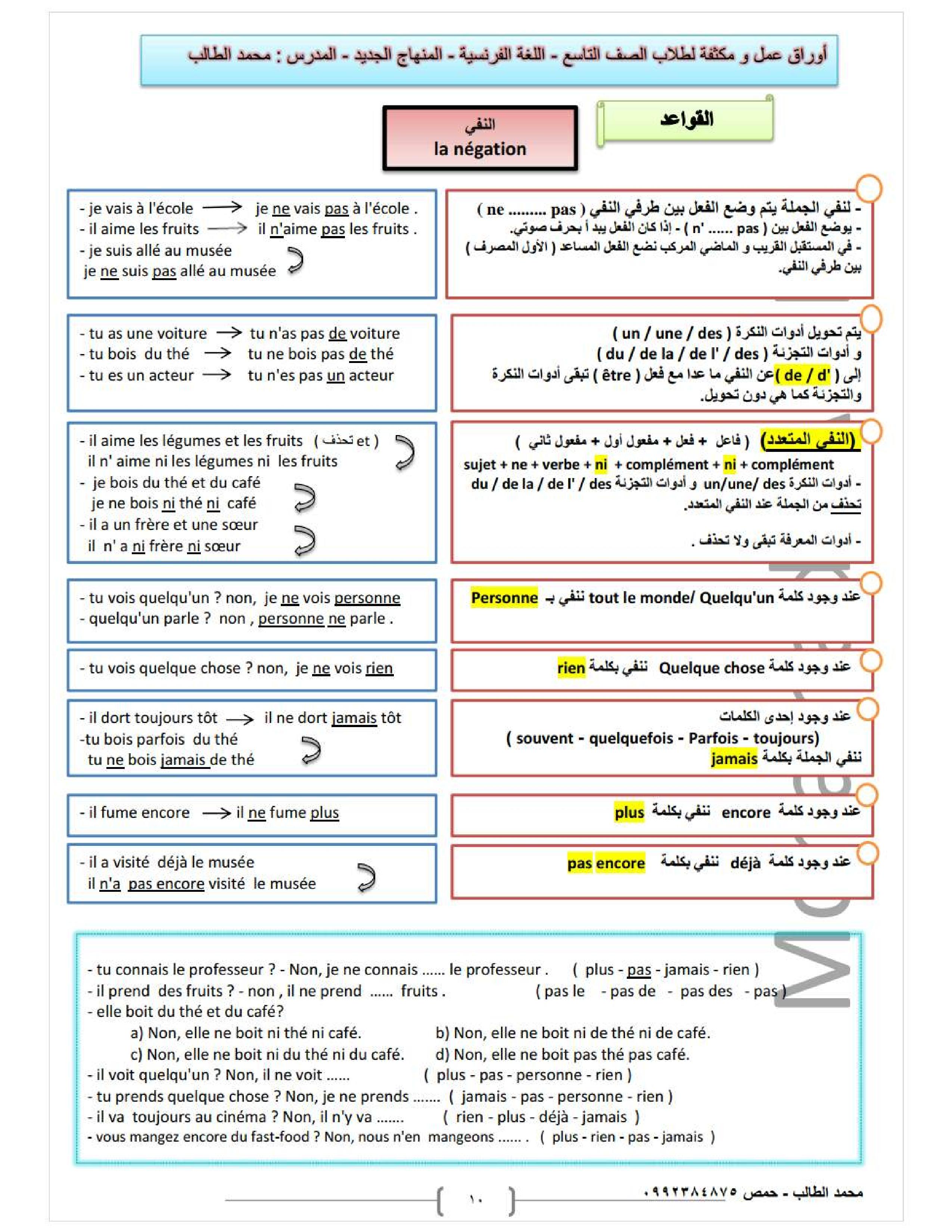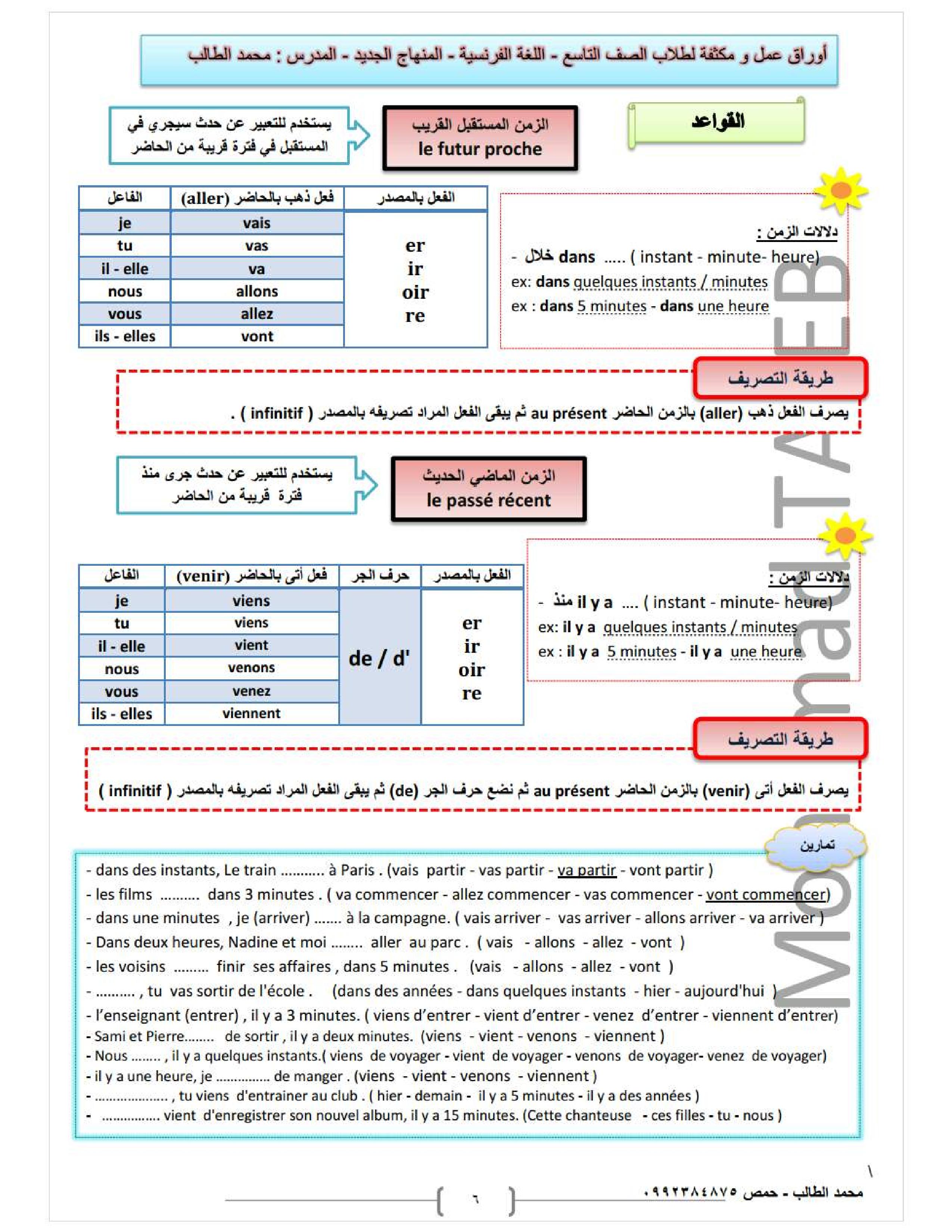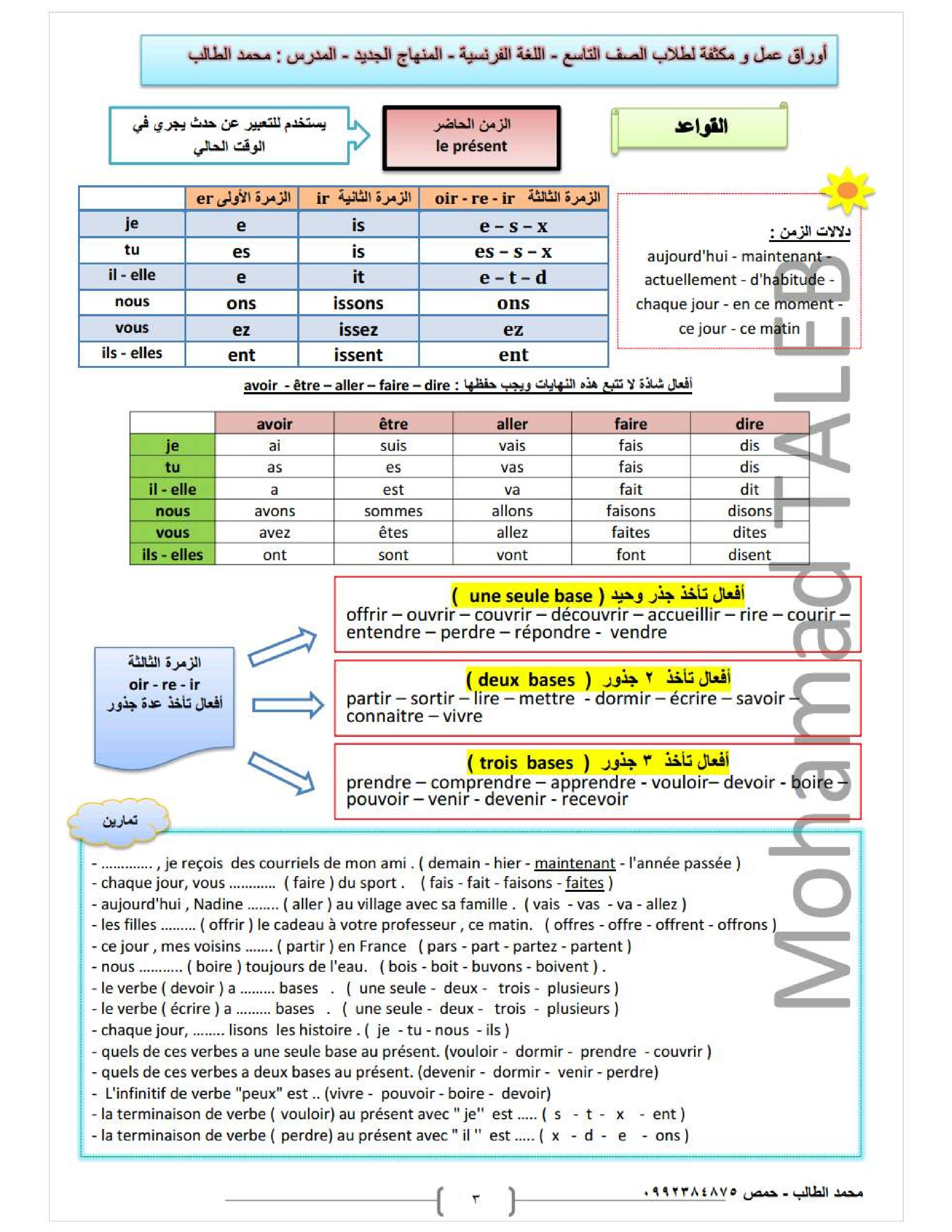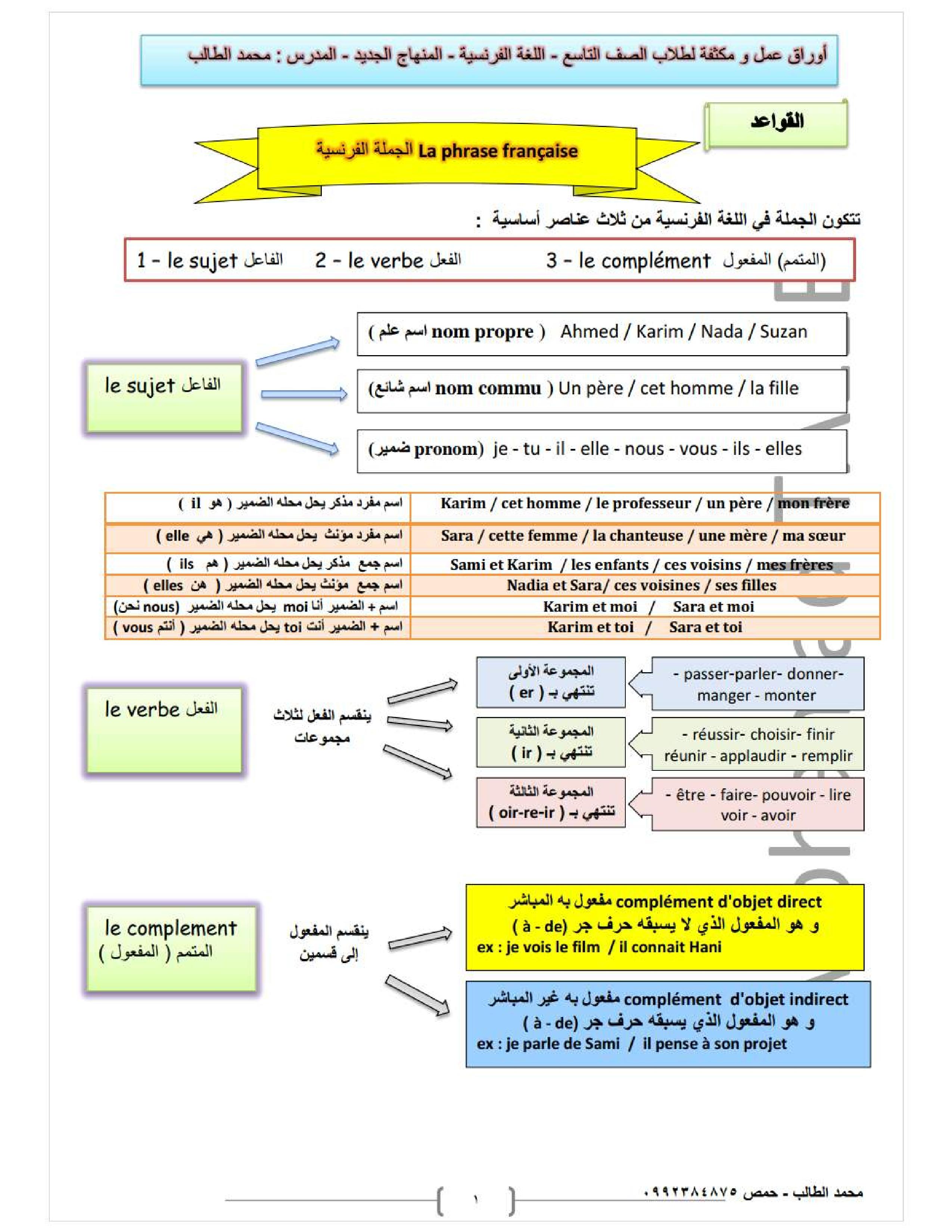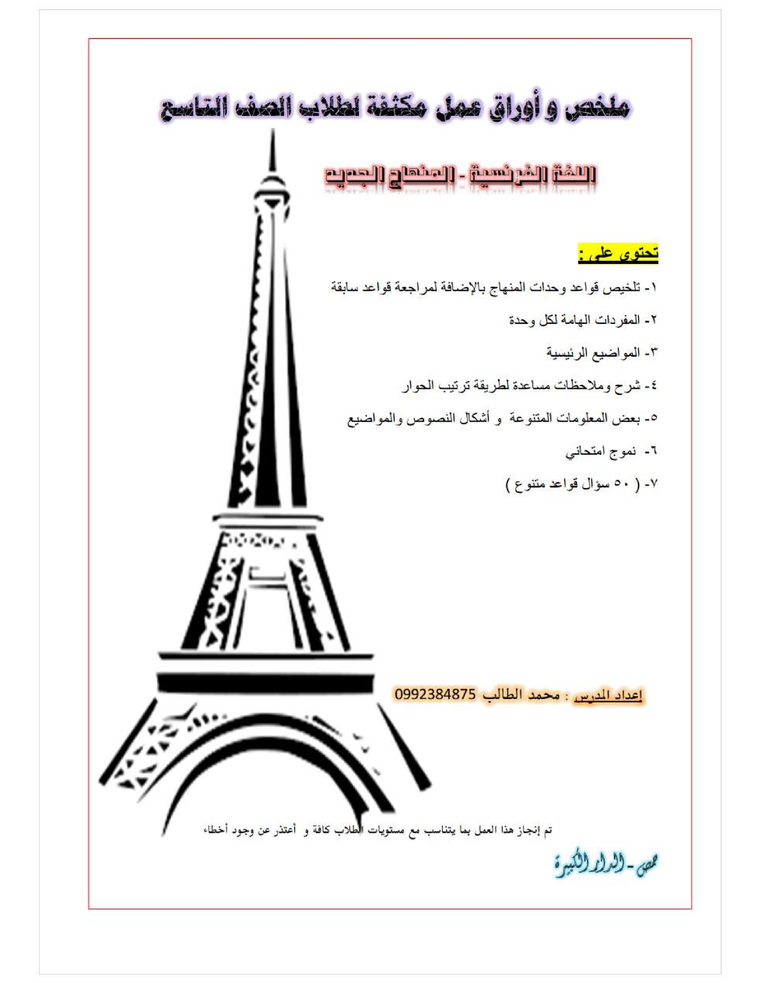 مكثفة شاملة لكافة التعديلات في المنهاج الجديد اللغة الفرنسية الصف التاسع