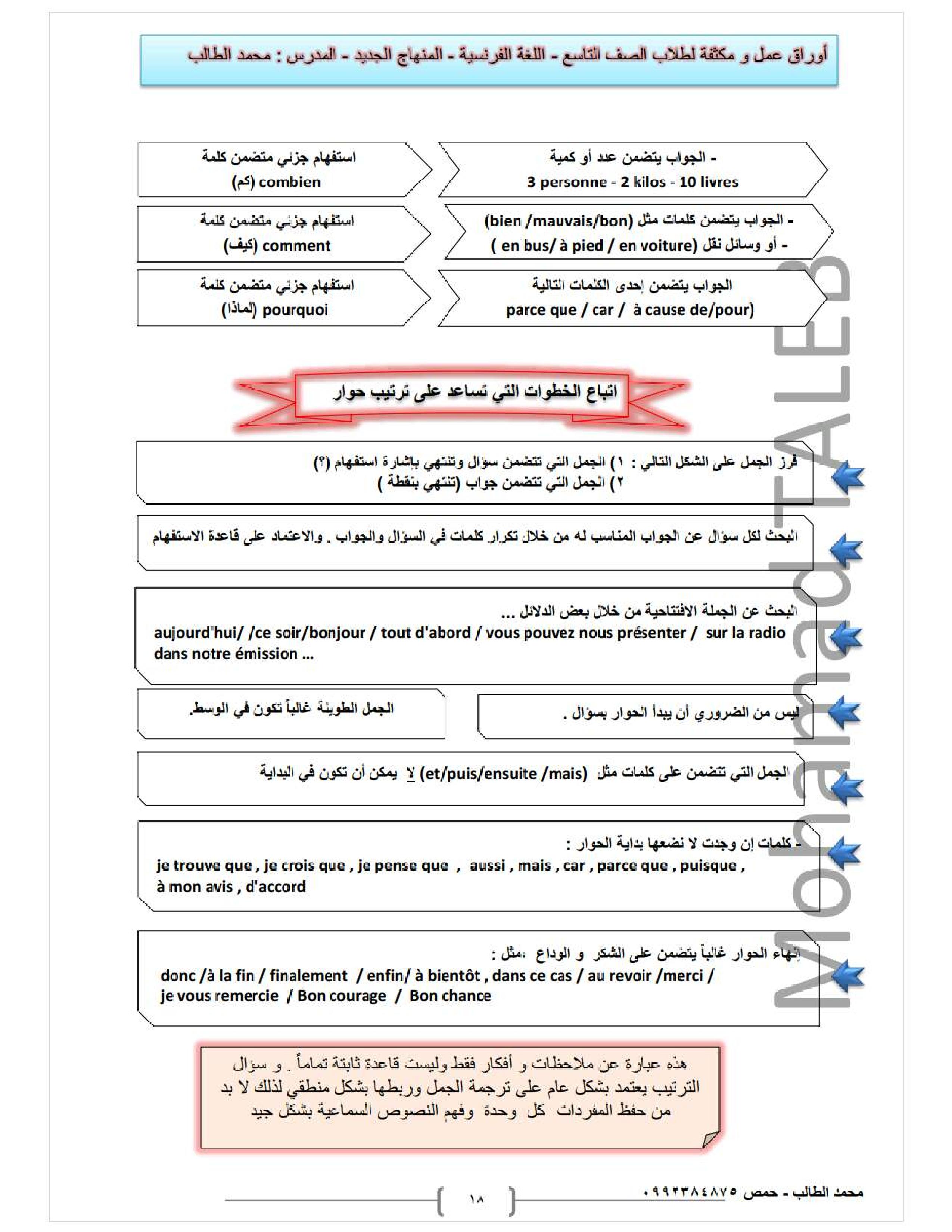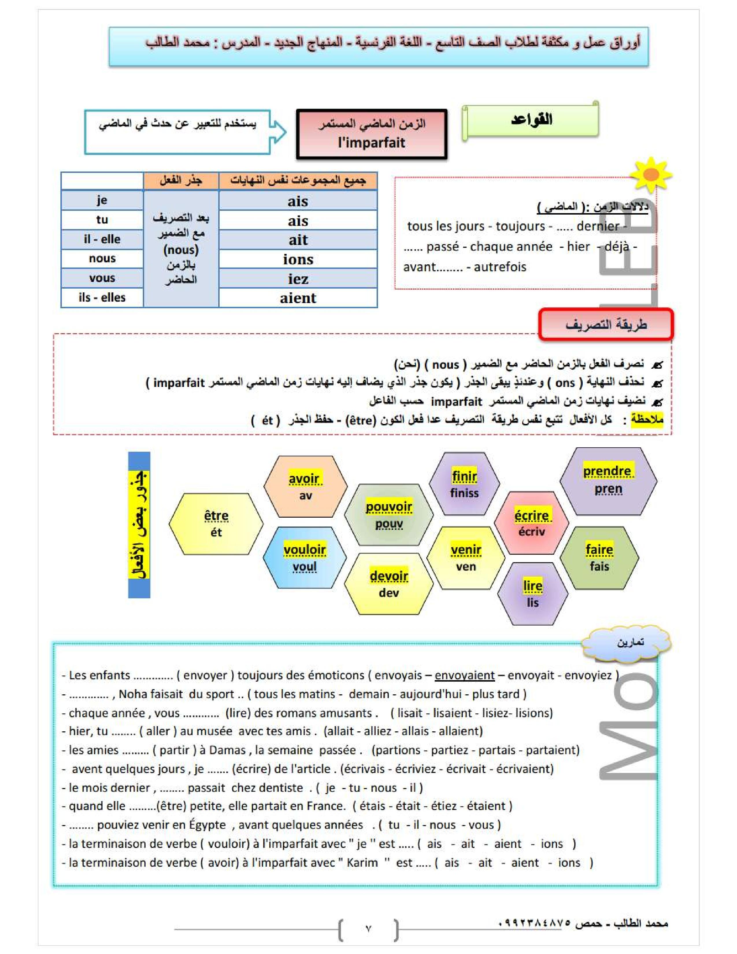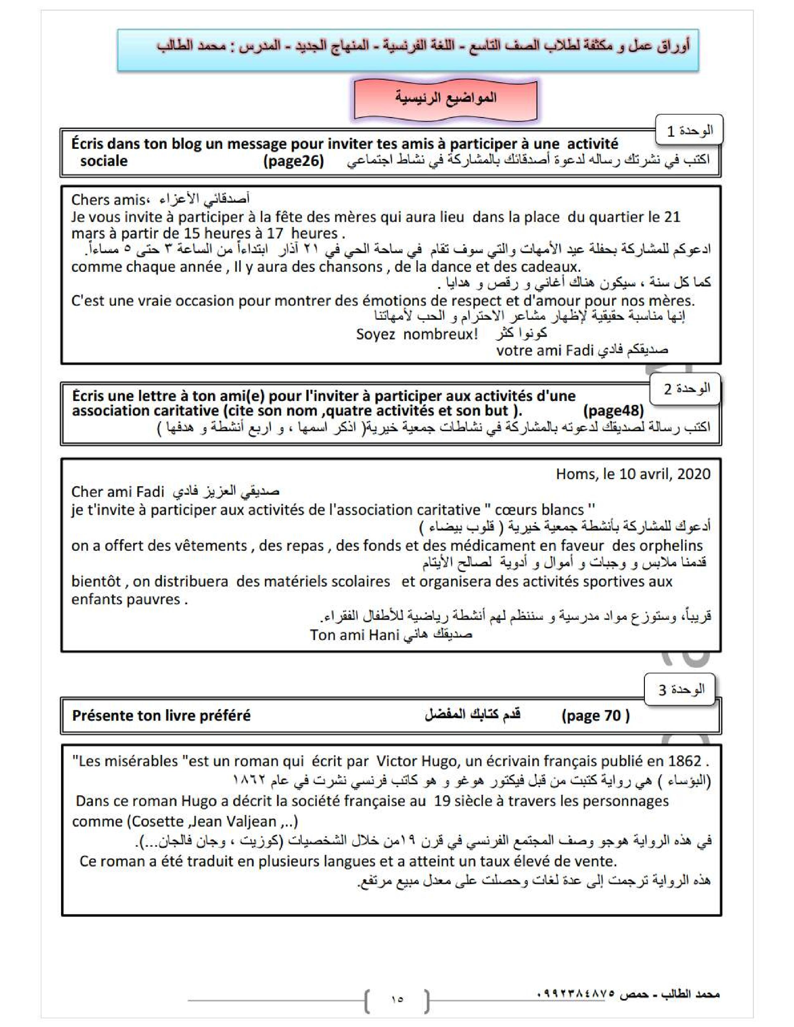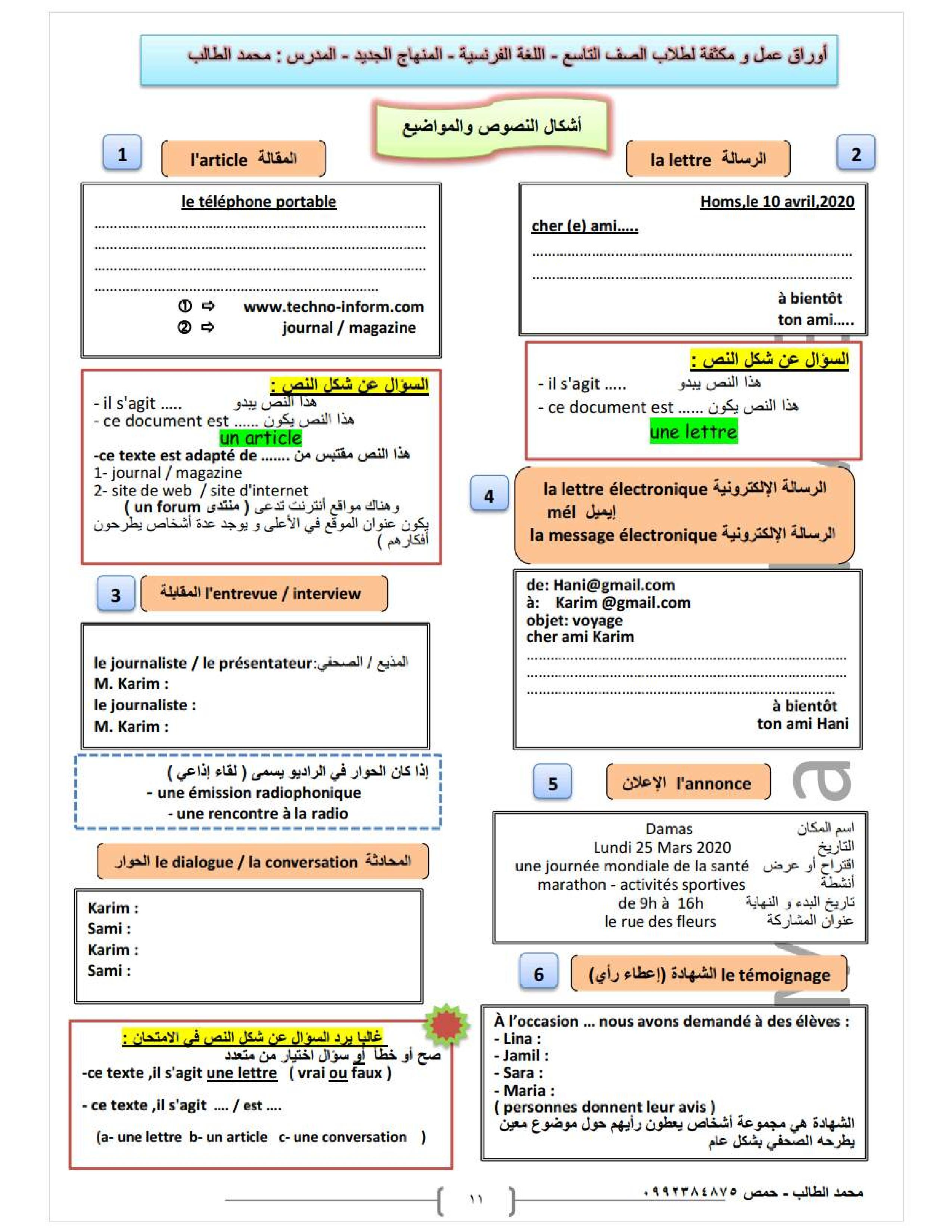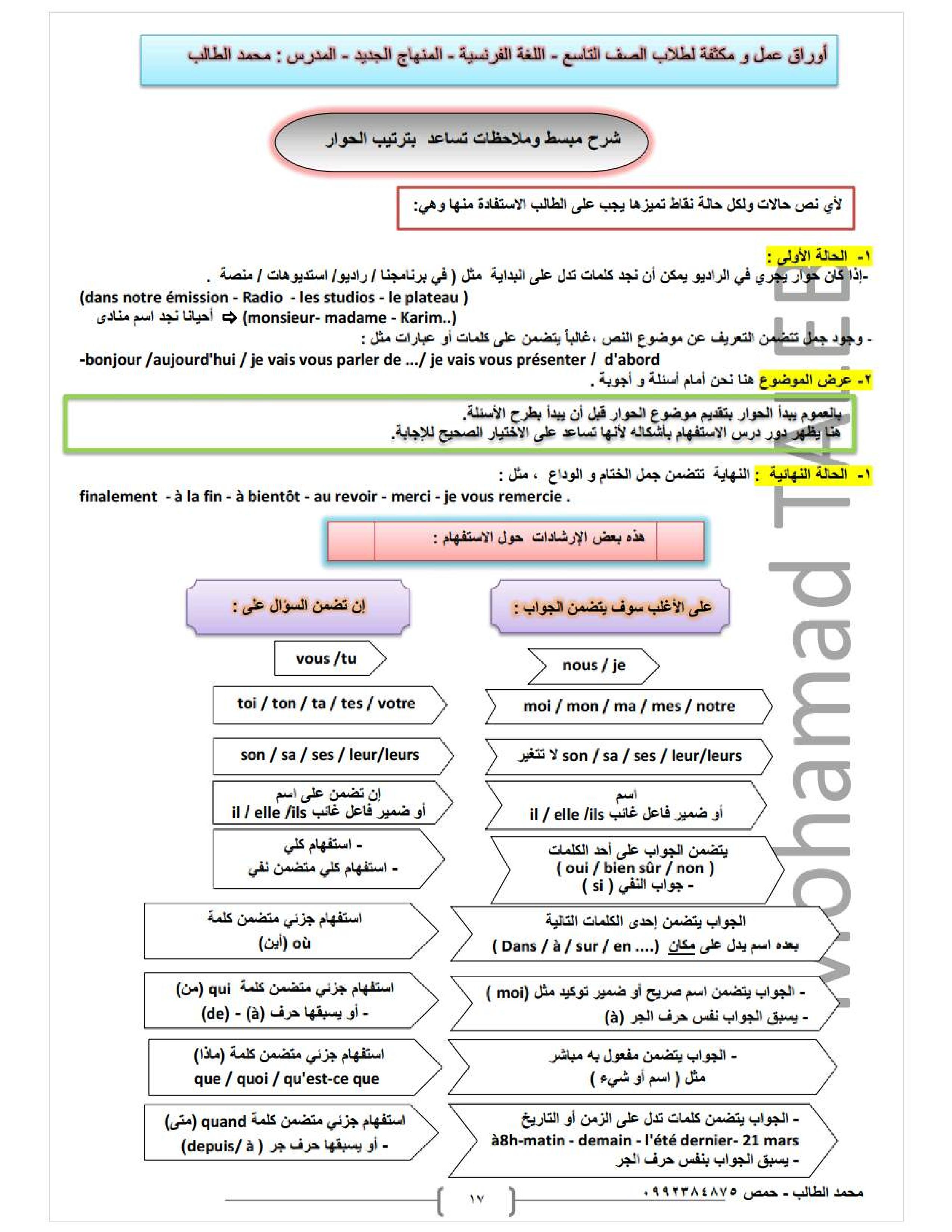 مكثفة شاملة لكافة التعديلات في المنهاج الجديد اللغة الفرنسية الصف التاسع
