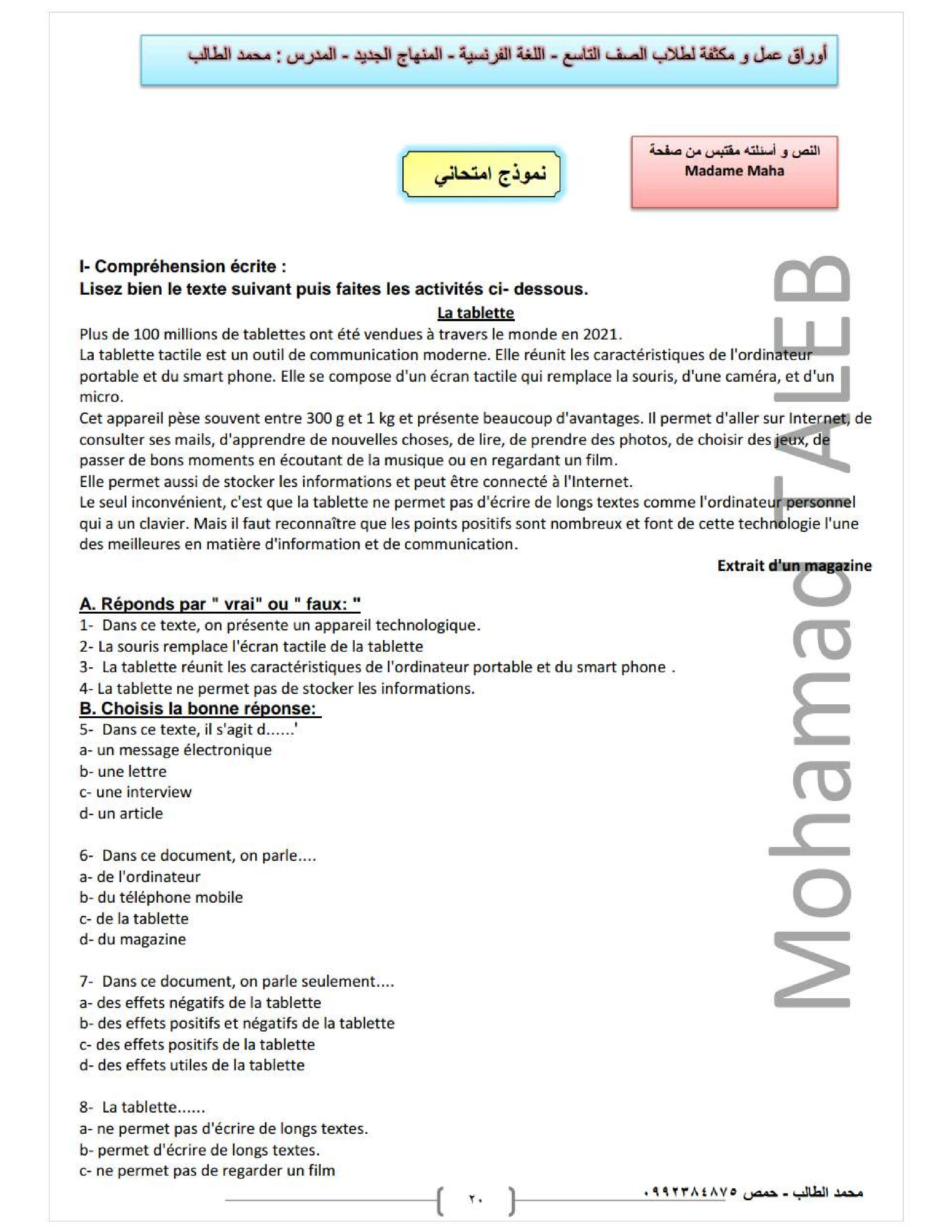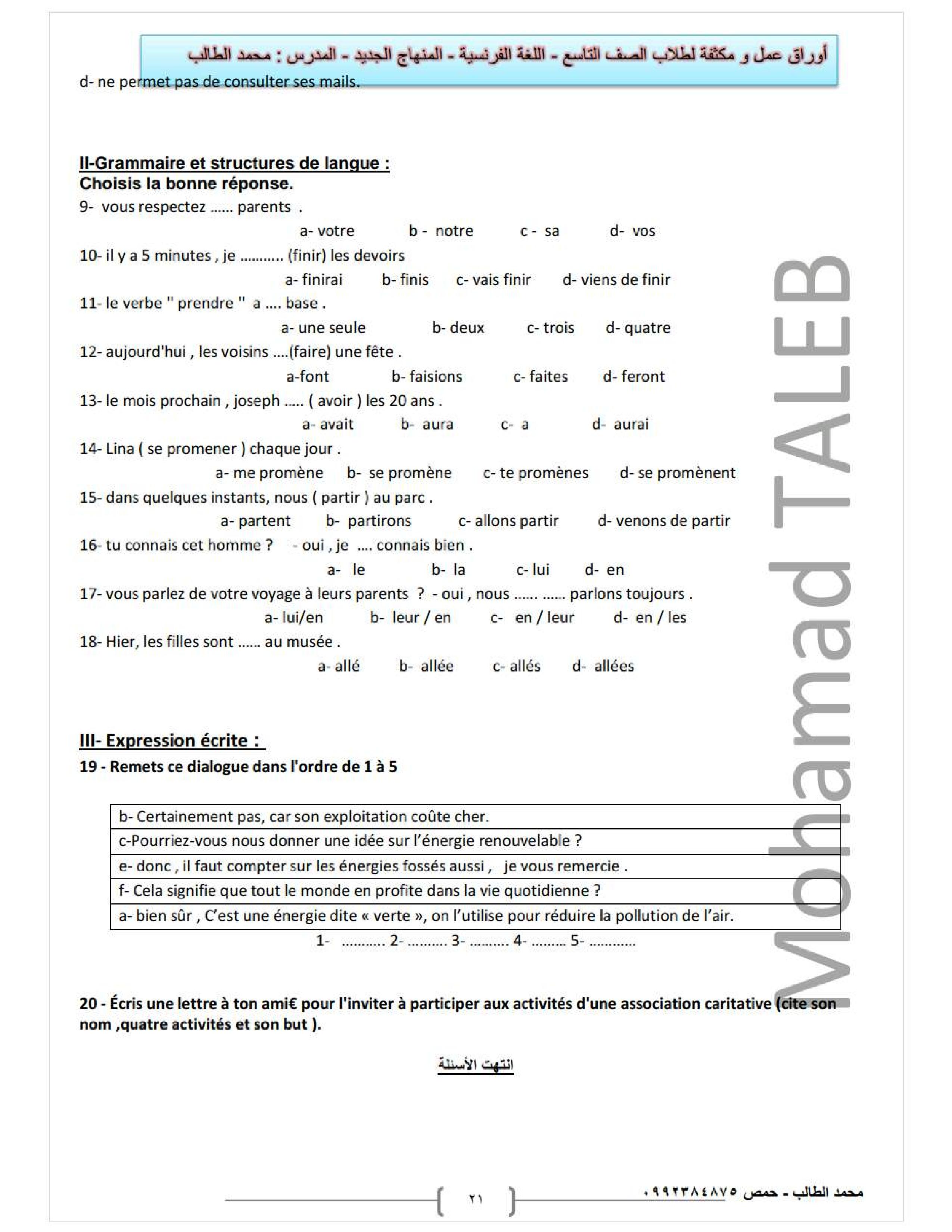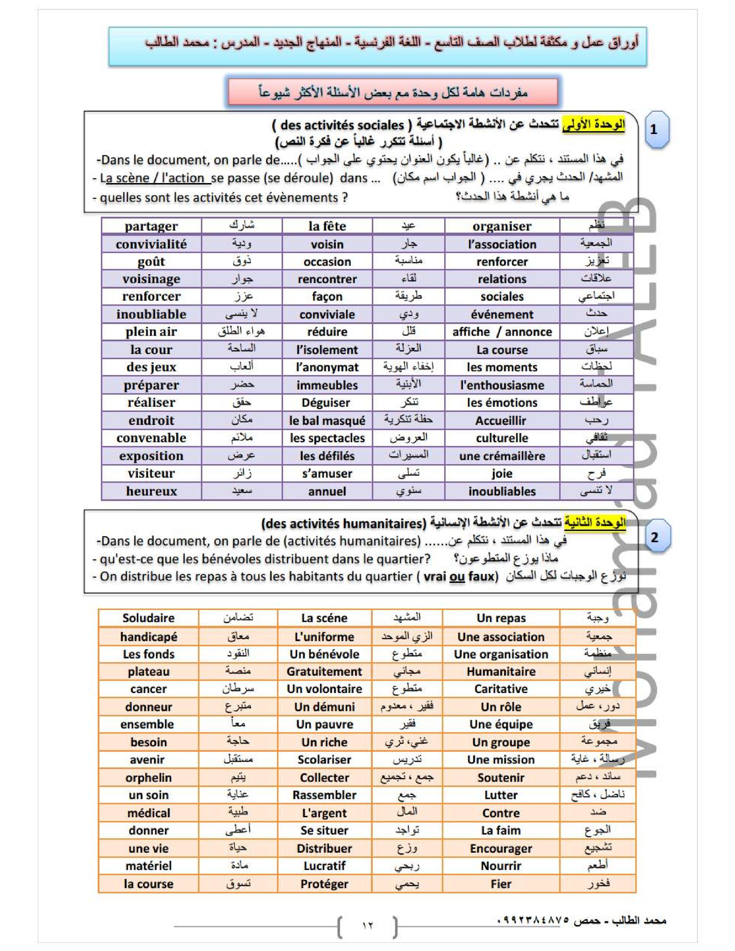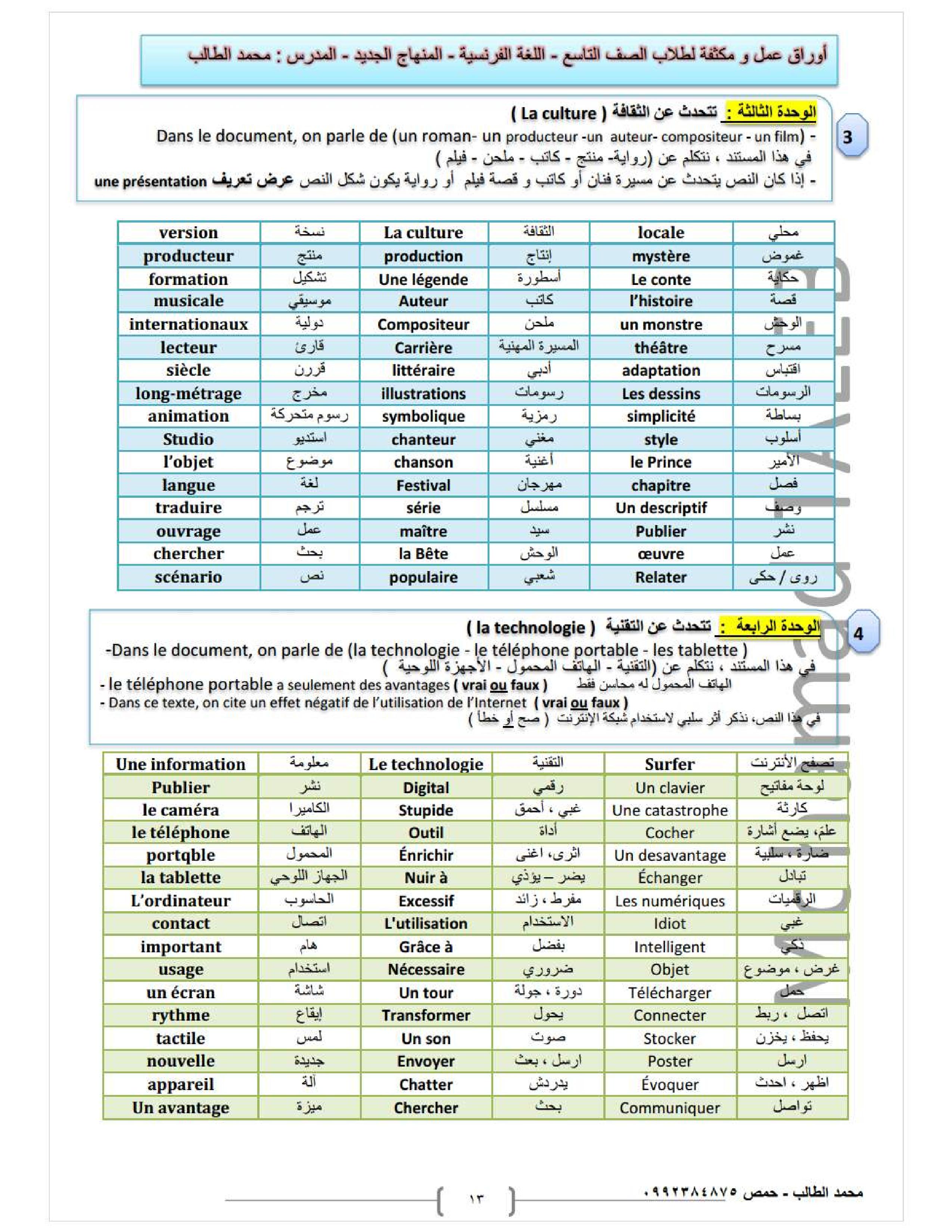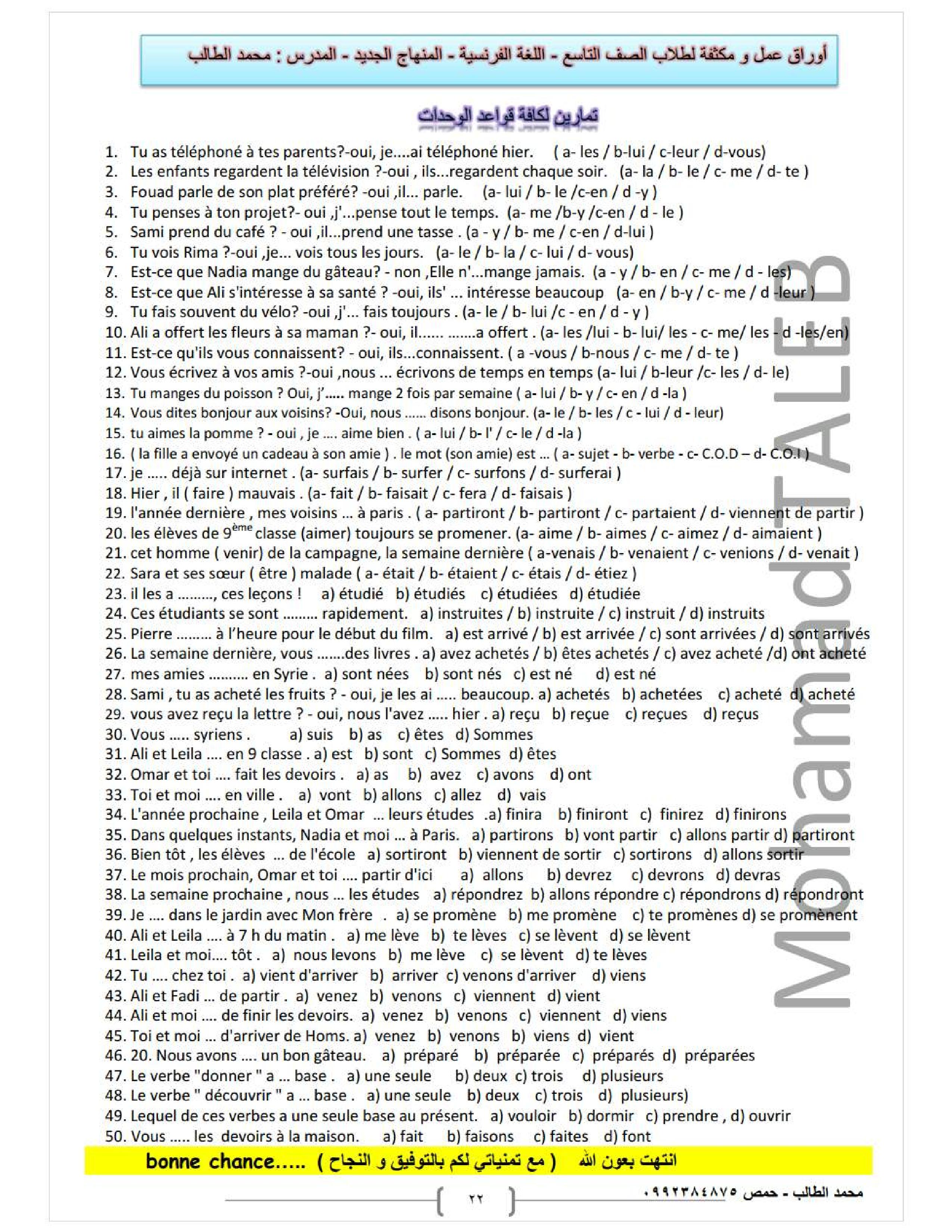 مكثفة شاملة لكافة التعديلات في المنهاج الجديد اللغة الفرنسية الصف التاسع